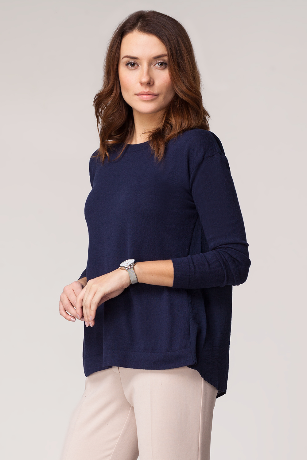 Вязаный джемпер свободного силуэта. Передняя часть и рукава выполнены из пряжи с добавлением нити люрекса, которая придает изделию мягкий блеск. Удлиненная спинка изделия из блузочной ткани дополнена неглубоким разрезом с завязкой на бант.