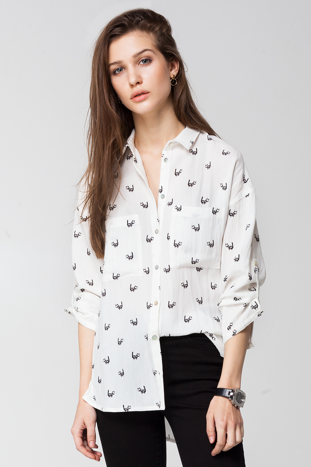 Блуза из мягкой штапельной вискозы с оригинальным принтом. Изделие свободного покроя со спущенным плечом, длина рукава регулируется застежкой на пату. Удлиненная спинка с заниженной кокеткой. Спереди два накладных кармана.