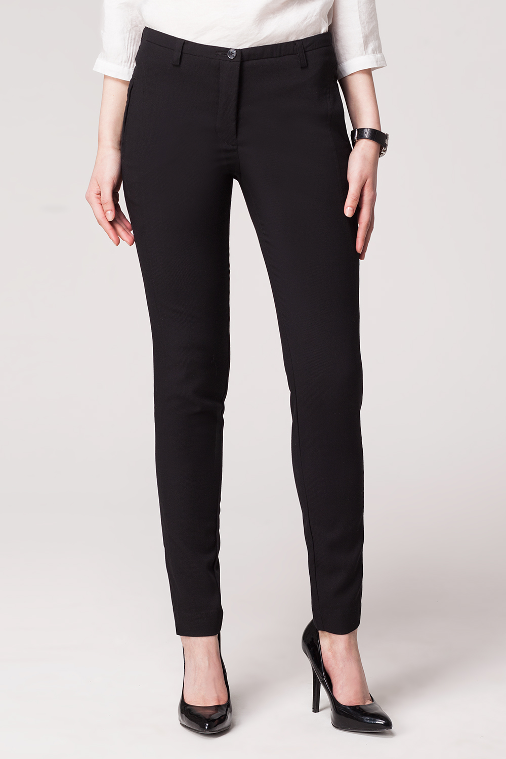 Брюки прямого кроя выполнены из эластичной фактурной костюмной ткани. Спереди изделие дополнено декоративным вертикальным швом с отстрочкой и вертикальными карманами в рамку. Задние карманы-обманки с отделкой из иск.кожи.