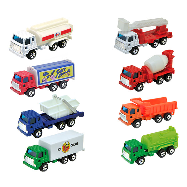 В ассортименте представлено множество грузовиков: один перевозит бензин, другой поставляет в магазин продукты