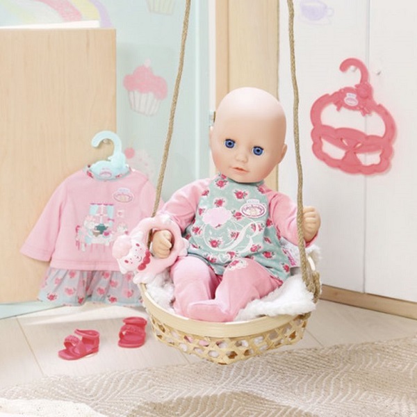 У куклы мягконабивное тело, твердая голова и конечности. Если положить куклу горизонтально, то ее голубые глаза закроются. В комплекте: кукла с платьем и комбинезончиком, сандалии и погремушка.
