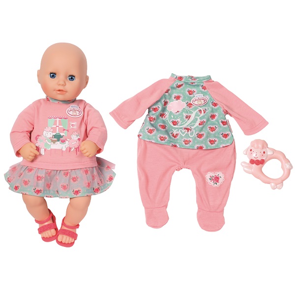 У куклы мягконабивное тело, твердая голова и конечности. Если положить куклу горизонтально, то ее голубые глаза закроются. В комплекте: кукла с платьем и комбинезончиком, сандалии и погремушка.
