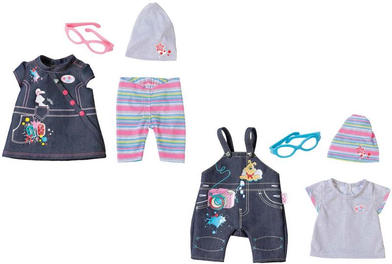 Джинсовая одежда предназначена для куклы BABY born 43 см и представлена двумя наборами. В один входит джинсовое платье, цветные леггинсы, шапочка и солнечные очки. В другой - футболка, комбинезон, шапочка и солнечные очки. Теперь твоя Бэби бон будет самой модной!