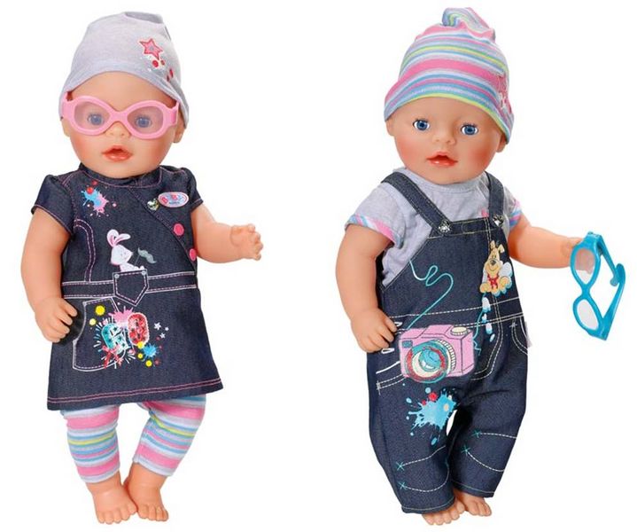 Джинсовая одежда предназначена для куклы BABY born 43 см и представлена двумя наборами. В один входит джинсовое платье, цветные леггинсы, шапочка и солнечные очки. В другой - футболка, комбинезон, шапочка и солнечные очки. Теперь твоя Бэби бон будет самой модной!