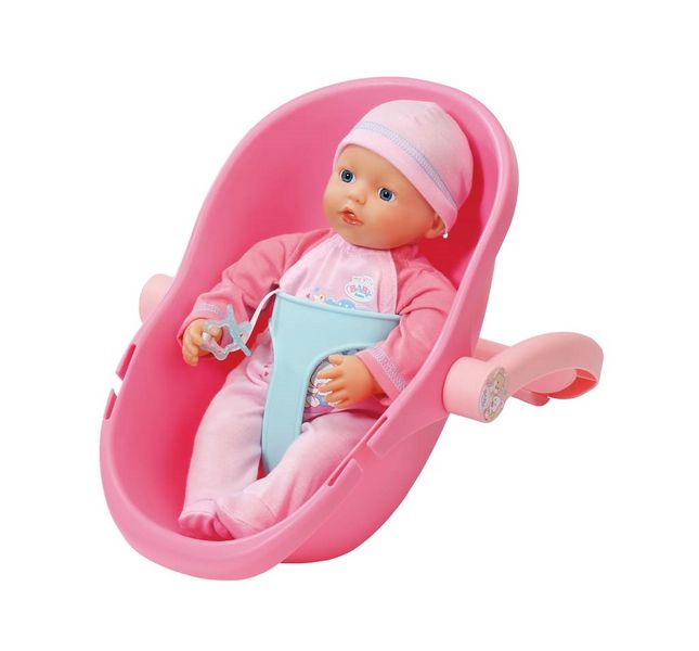 В наборе мягконабивная кукла с твердыми конечностями и твердой головой и кресло-переноска. Кукла одета в комбинезончик и шапочку, с соской в комплекте.