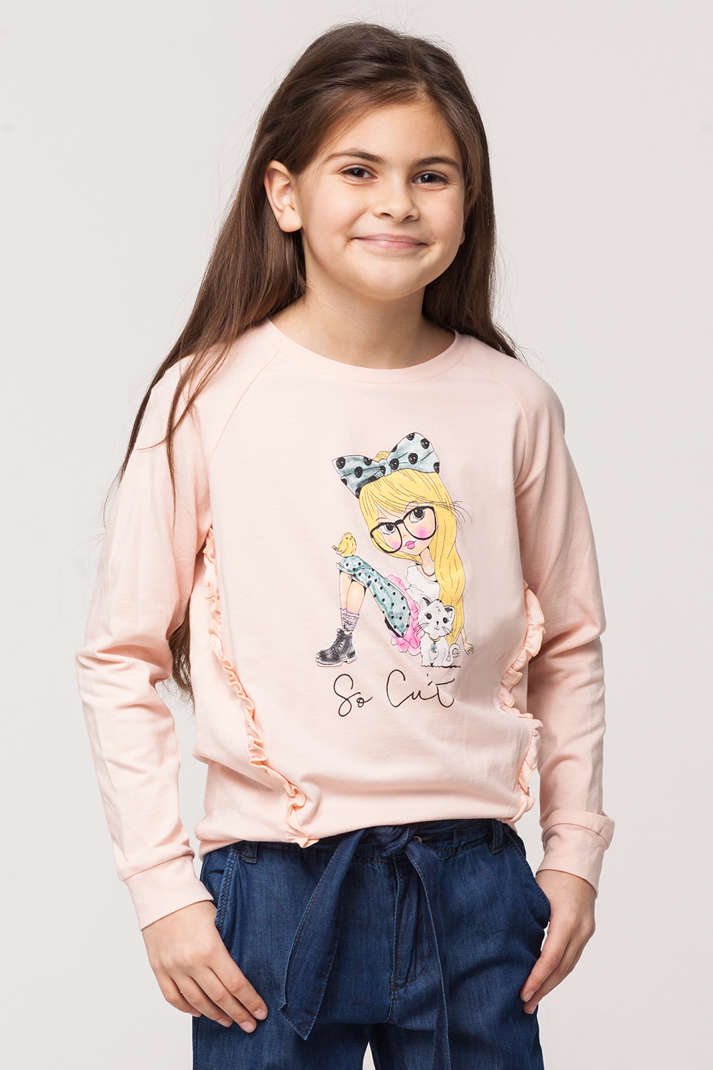 Футболка с длинным рукавом выполнена из эластичного хлопкового полотна. Смещенные боковые швы дополнены оборками, спереди декоративный принт.