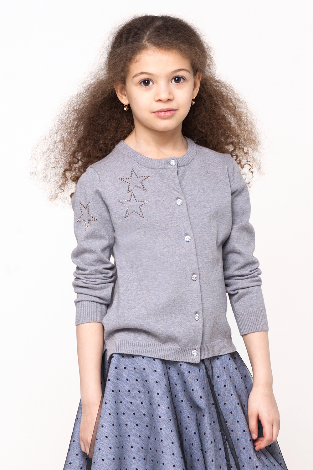 Классический вязанный жакет с застежкой на планку на пуговицы-кристаля. Изделие с удлиненной спинкой, спереди декоративный рисункок "звезды" выполнен металлическими стразами