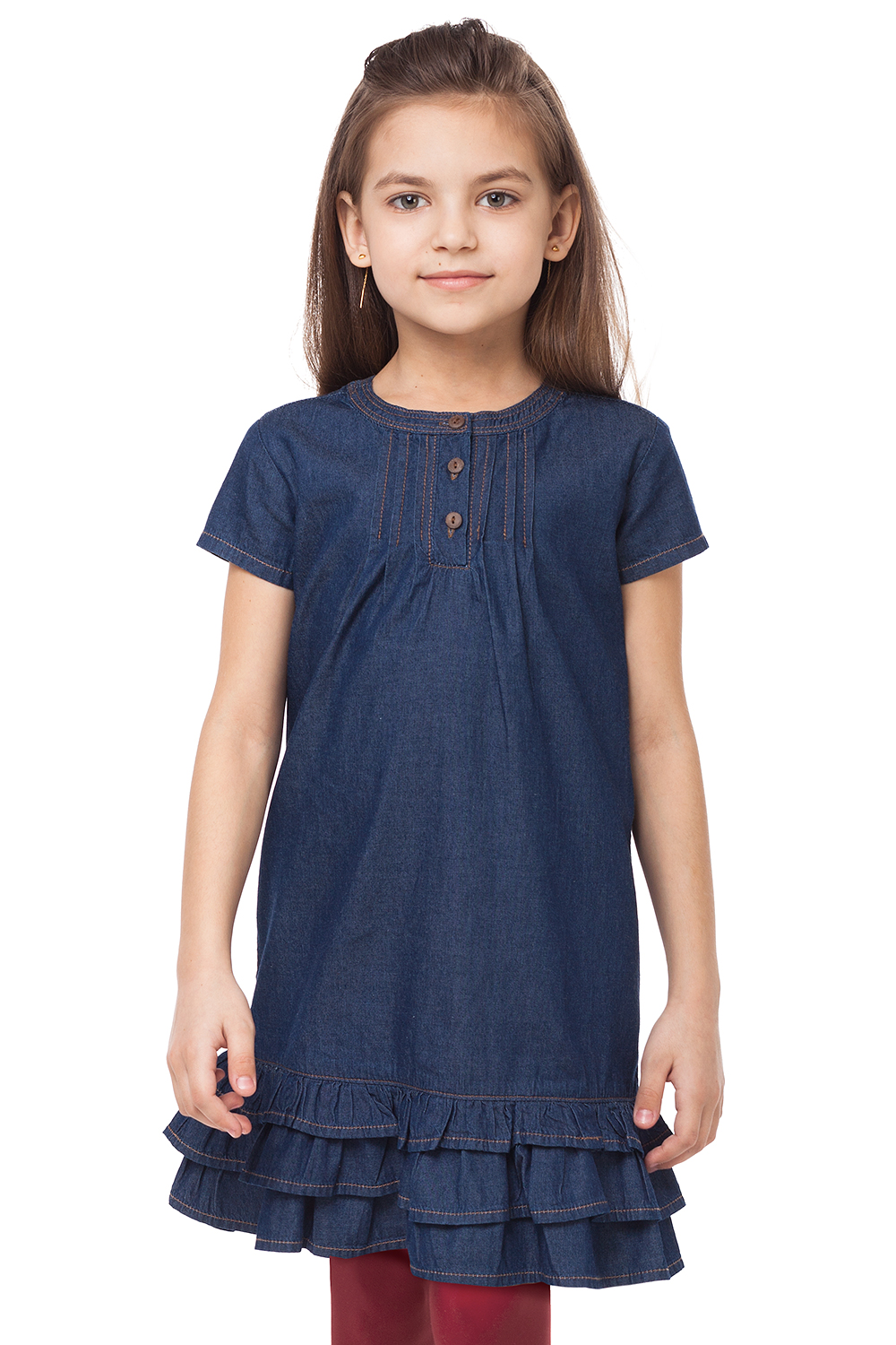 Платье свободного силуэта выполнено из мягкого темно-синего денима. Модель украшена контрастными отстрочками и тремя ряд воланов по низу изделия.