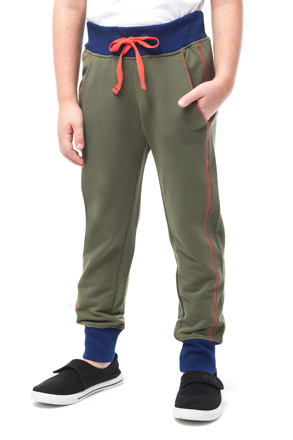 Брюки для мальчика в спортивном стиле выполнены из эластичного футера. Манжеты и пояс из рибаны. Канты вдоль карманов и декоративные отстрочки контрастного цвета. Пояс на резинке и завязке на шнурок.