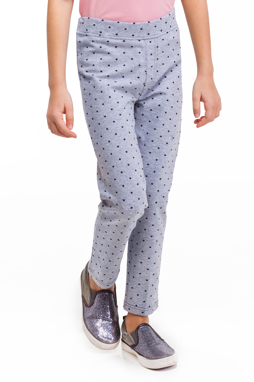 Брюки прямого кроя выполнены из эластичного футера в мелкий горошек. Отрезной пояс на резинке. Сзади накладные карманы с принтом из глиттера.