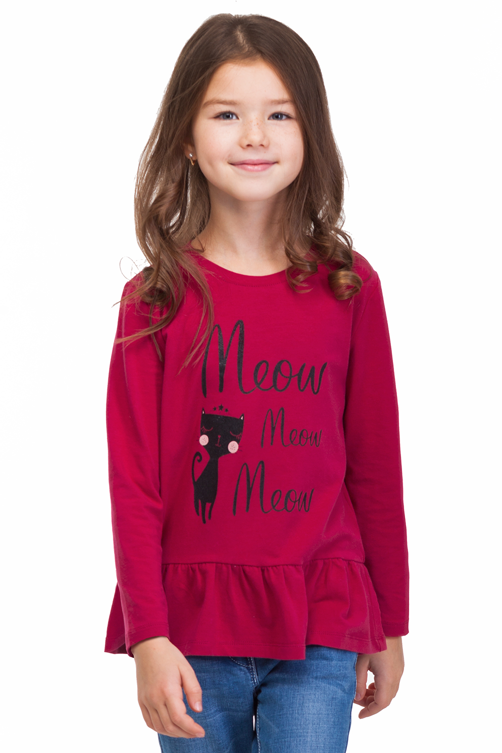 Футболка с длинным рукавом выполнена из эластичного хлопкового полотна. Низ изделия дополнен баской. Спереди декоративный принт.