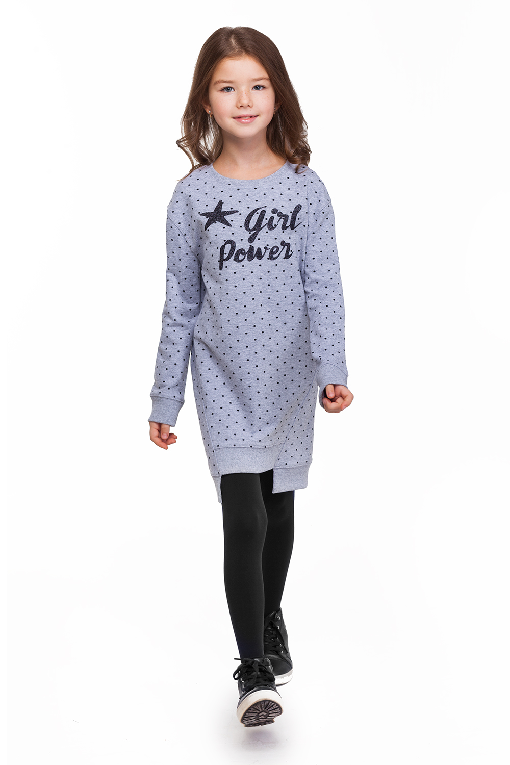 Платье-толстовка выполнено из эластичного футера в мелкий горошек. Изделие зауженного силуэта со смещенными боковыми швами. Модель дополнена деталями из рибаны в тон изделия. Спереди декоративный принт с глиттером.