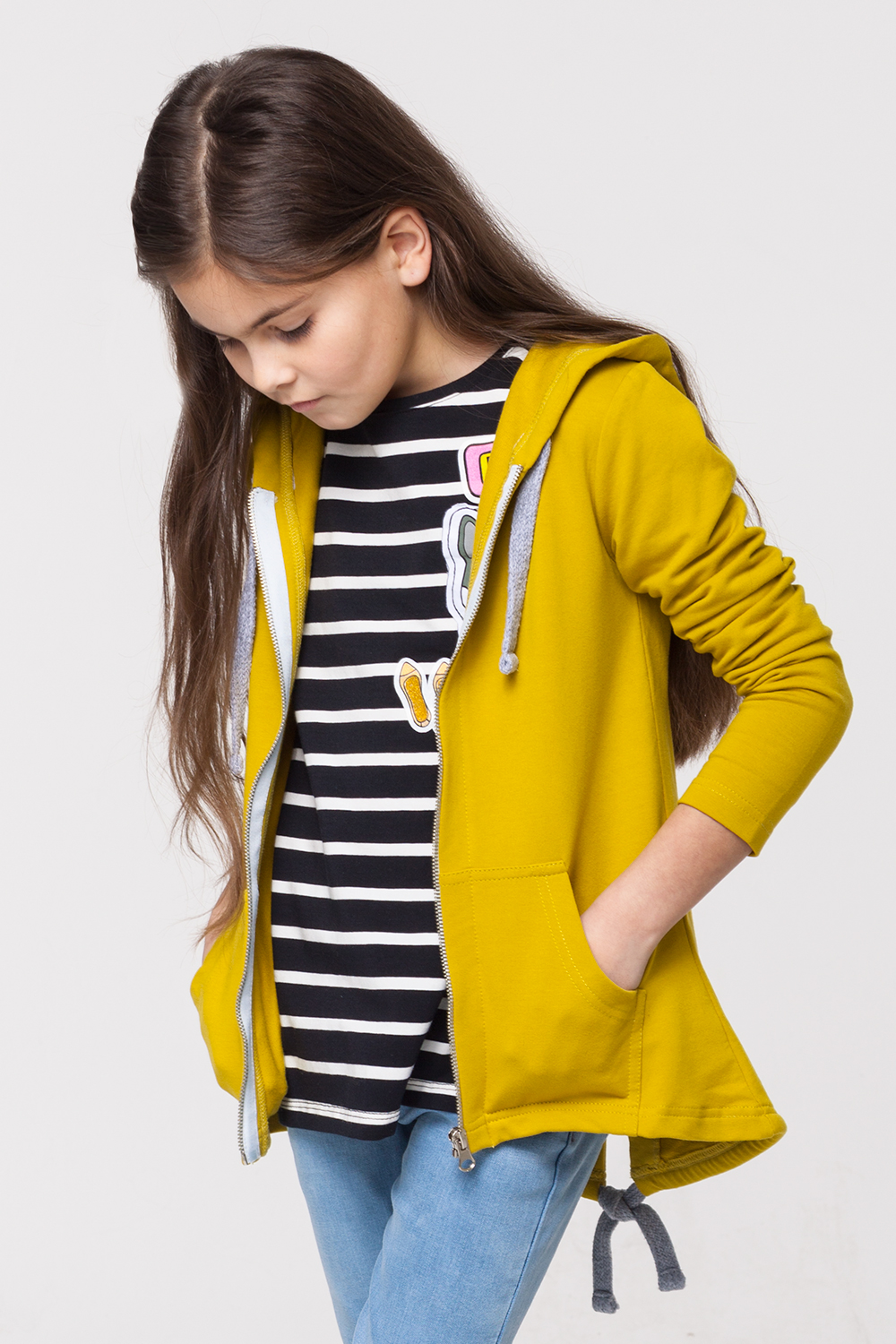Однотонная толстовка на молнии с капюшоном выполнена из эластичного двухниточного футера. Оригинальный свободный силуэт изделия с удлиненной спинкой. Спереди накладные карманы. По краю капюшона и по низу изделия сзади - хлопковая тесьма, позволяющая регулировать объем.