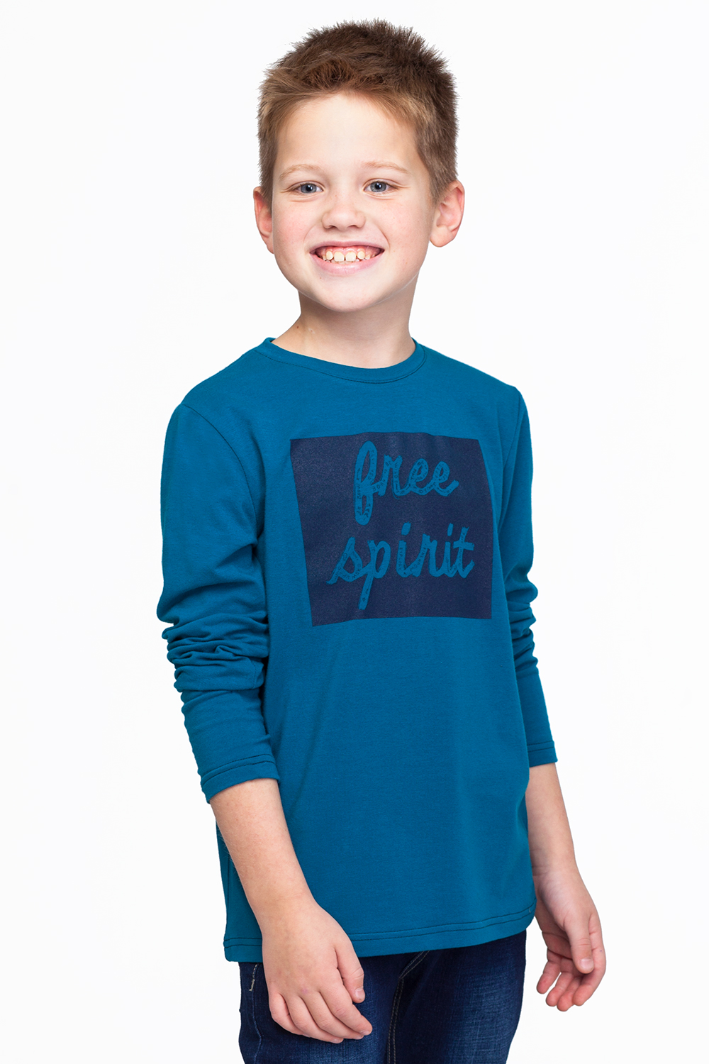 Футболка с длинным рукавом выполнена из однотонного трикотажного полотна. Модель дополнена декоративным принтом.