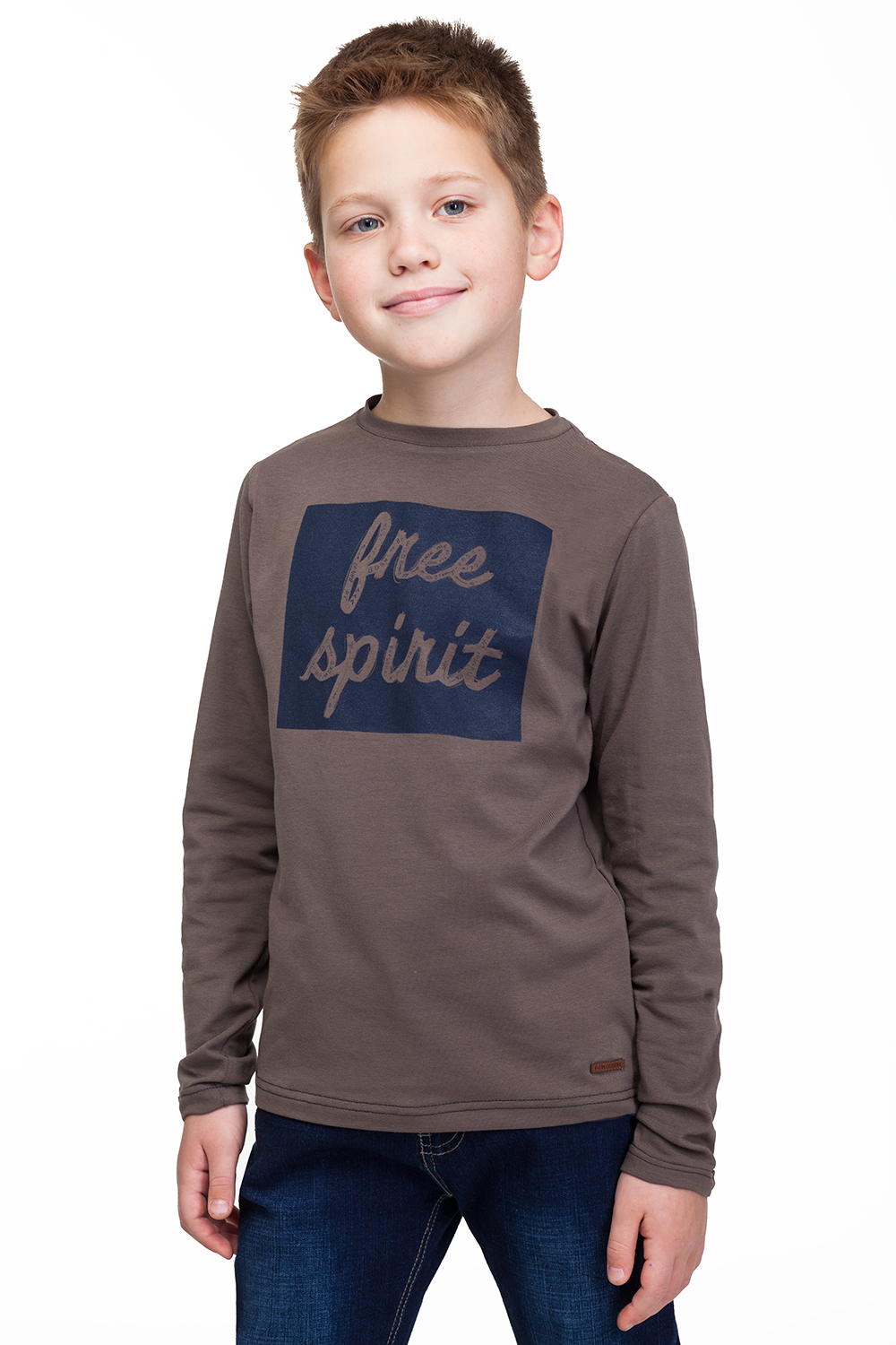 Футболка с длинным рукавом выполнена из однотонного трикотажного полотна. Модель дополнена декоративным принтом.