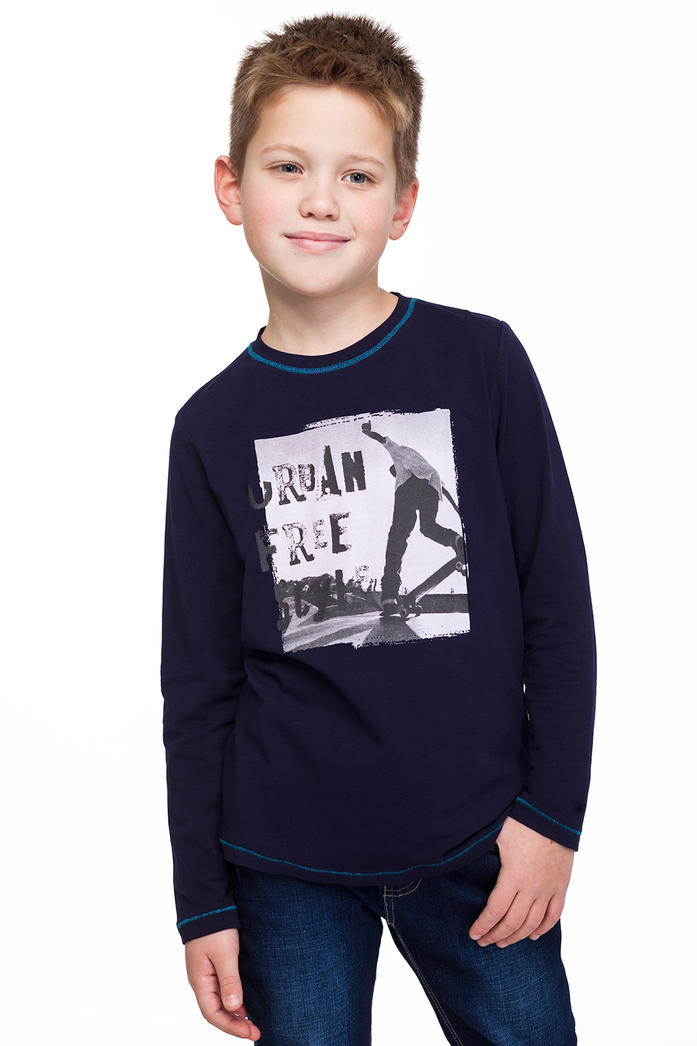 Футболка с длинным рукавом выполнена из однотонного трикотажного полотна. Модель дополнена контрастными отстрочками, спереди декоративный принт.