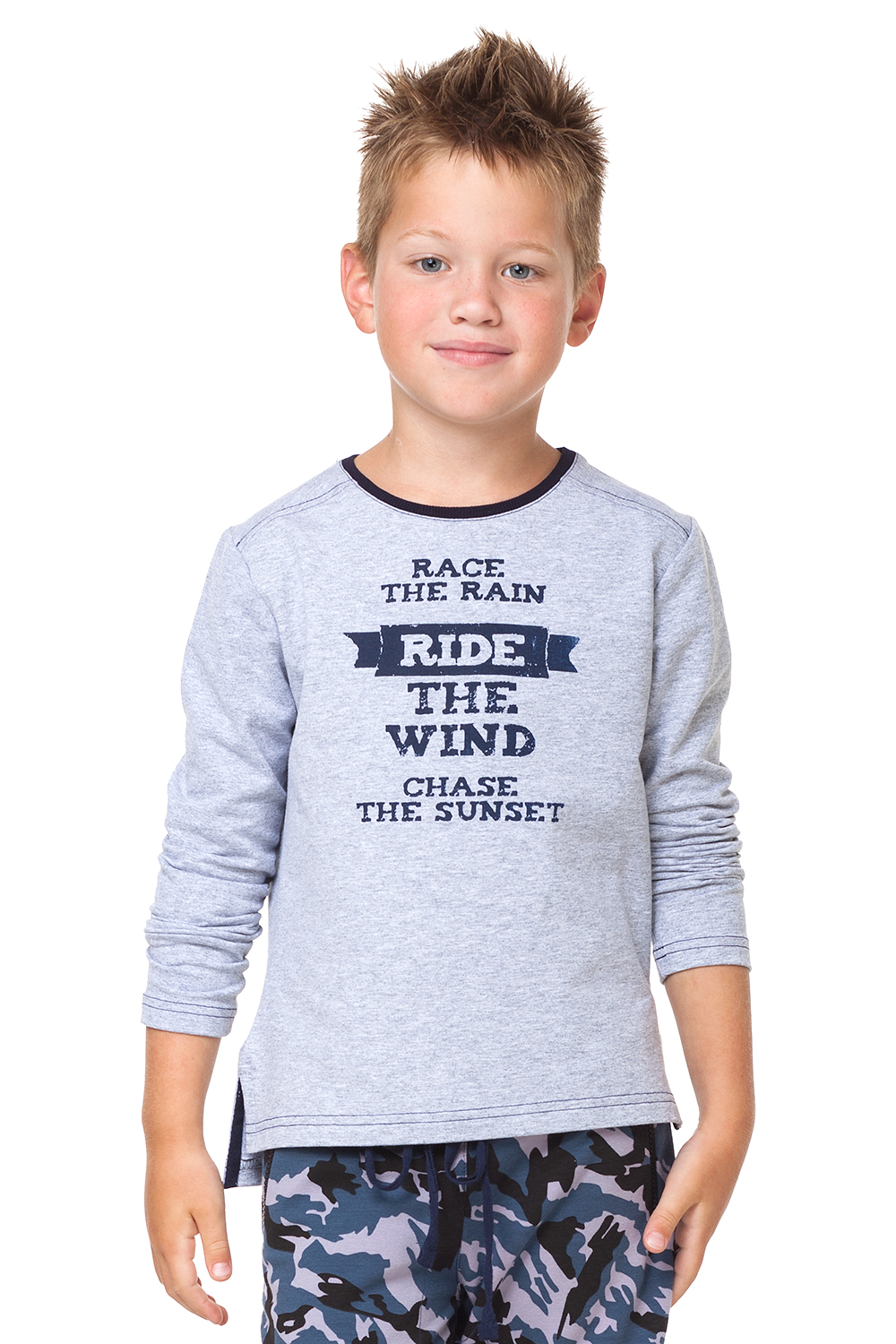 Джемпер для мальчика выполнен из плотного хлопкового полотна. Изделие дополнено отстрочками контрастного цвета, горловина из рибаны. Спереди декоративный печатный принт.
