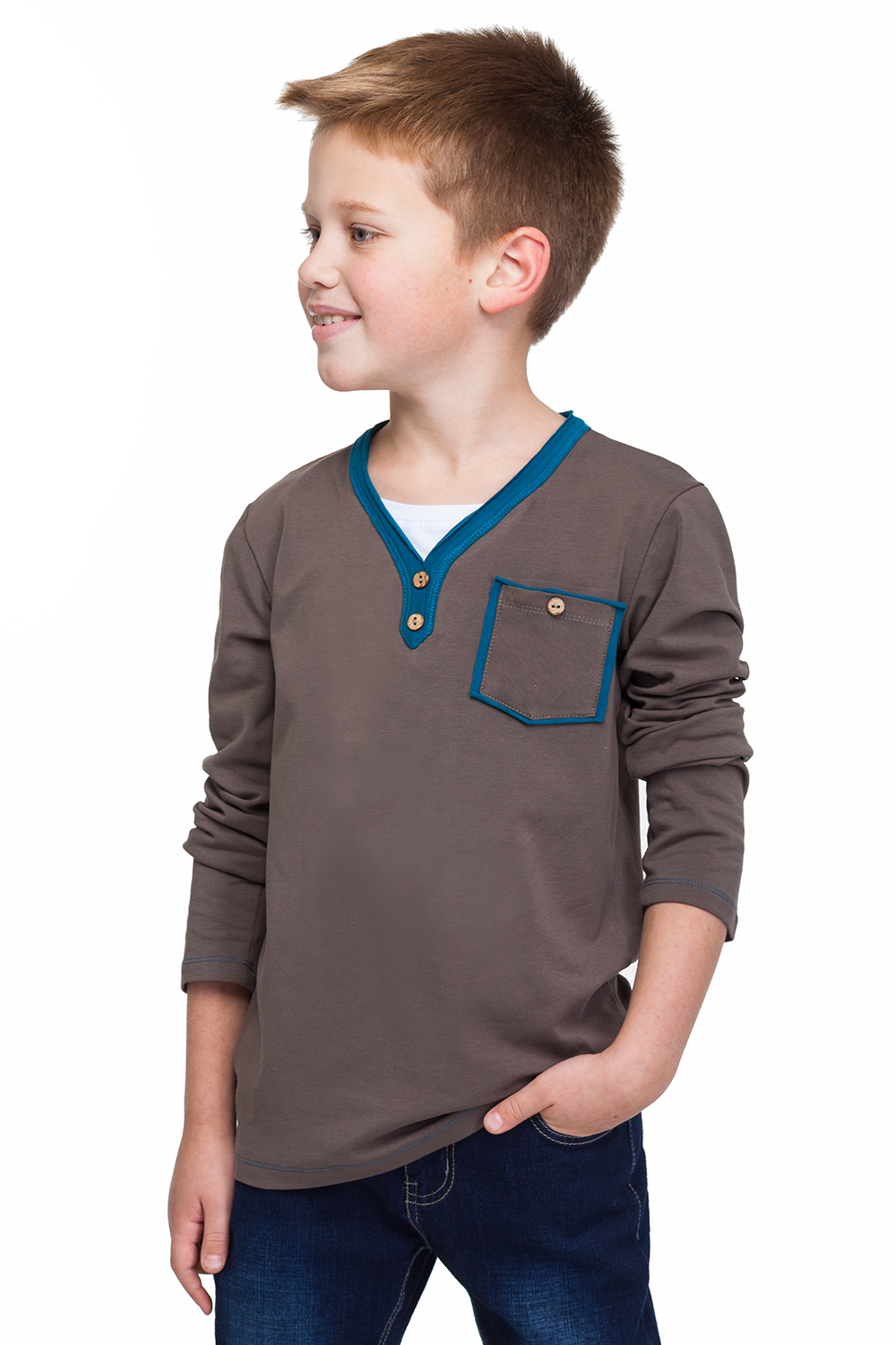 Футболка с длинным рукавом выполнена из однотонного трикотажного полотна. Воротник и детали отделки контрастного цвета, спереди накладной карман.