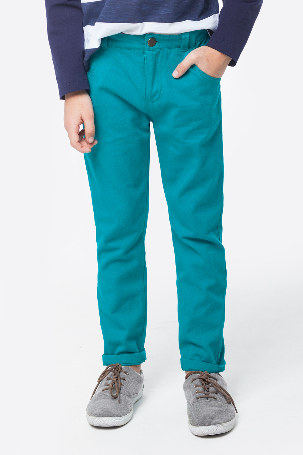 Яркие брюки прямого кроя выполнены из хлопкового полотна. Модель с 5 карманами и фурнитурой цвета состареного золота.