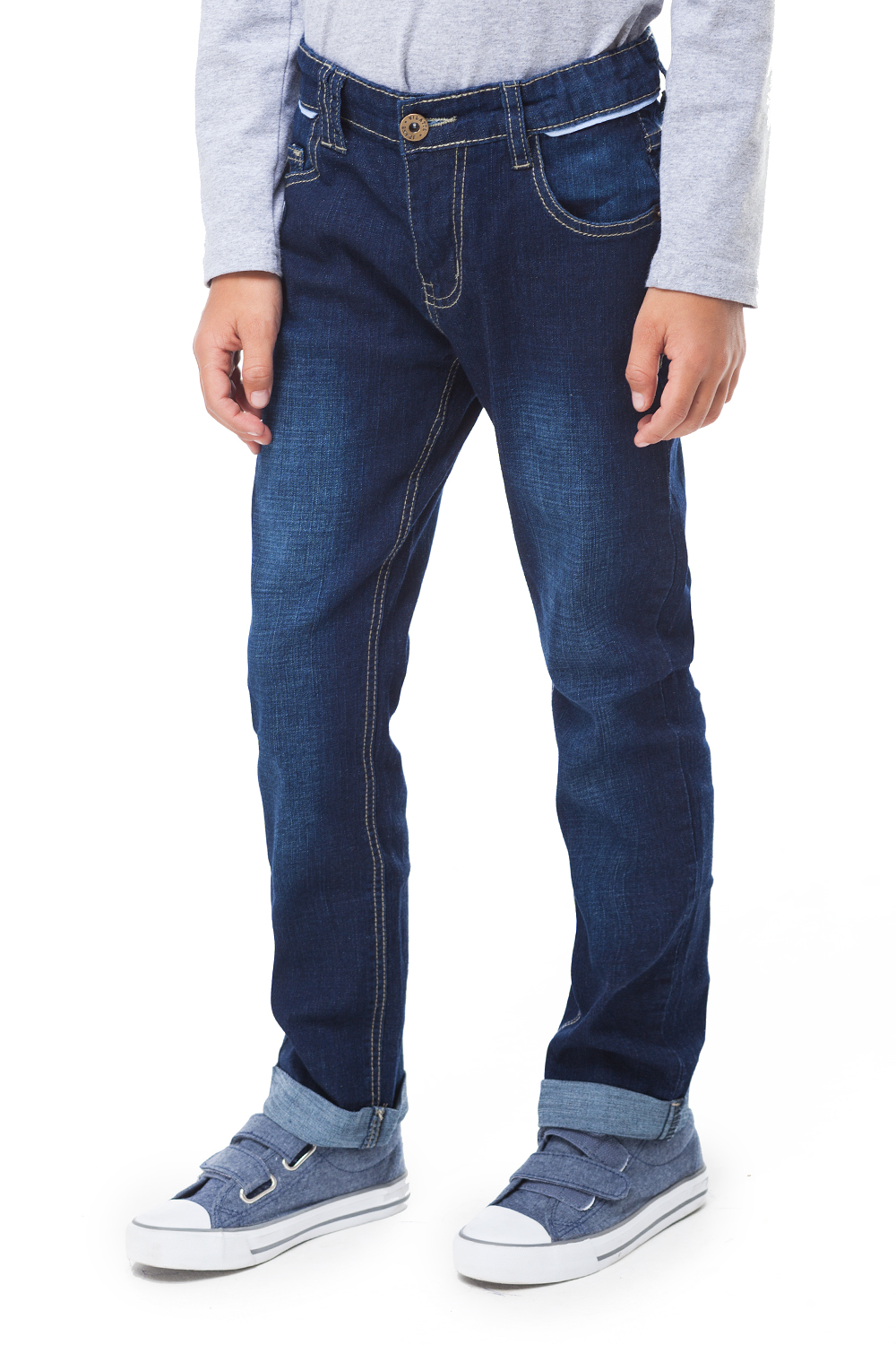 Джинсы для мальчика классического прямого кроя. Изделие со светлой стиркой, низ штанин с отворотом. Пояс с регулируемой резинкой для лучшей посадки на талии.