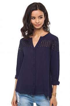 Женственная блузка свободного силуэта выполнена из хлопковой вуали с эффектом легкой жатости и дополнена декоративными вставками кружева. Изделие с V-образным вырезом горловины и укороченным рукавом.