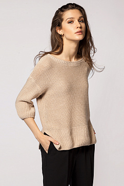 Джемпер с укороченным рукавом выполнен крупной фактурной вязкой с добавлением нити люрекса. Свободный силуэт со спущенным плечом и высокими боковыми разрезами.