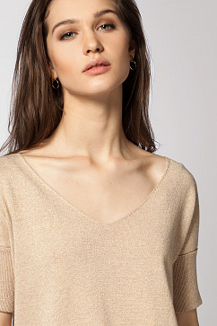Пуловер с коротким рукавом выполнен из вязаного трикотажа с добавлением нити люрекса. Oversize-крой, глубокий V-образный вырез. Спущенное плечо с широкой двойной манжетой. Изделие с удлиненной спинкой и деталями в рубчик.