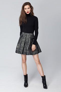 Юбка выполнена из плотной серебристой тафты с добавлением люрекса с узором под питона. Глубокие встречные складки, силуэт расширенный к низу. Сзади застежка на металлическую золотую молнию. Длина юбки увеличивается к большему размеру.