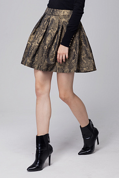 Юбка выполнена из плотной серебристой тафты с добавлением люрекса с узором под питона. Глубокие встречные складки, силуэт расширенный к низу. Сзади застежка на металлическую золотую молнию. Длина юбки увеличивается к большему размеру.