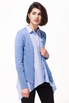 Приталенный жакет с драпированной планкой и асимметричной линией низа. Изделие связано из эластичной хлопковой пряжи. На манжете декоративная металлическая нашивка с логотипом.