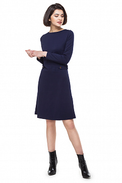 Платье облегающего силуэта с расклешенной юбкой красиво подчеркнет линию талии. Изделие выполнено из мягкого эластичного трикотажа. Сзади застежка на потайную молнию. Спереди декоративные элементы дополнены золотистой фурнитурой.
