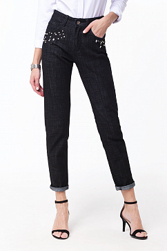 Джинсы прямого кроя выполнены из плотного денима. Покрой с пятью карманами. Спереди изделие дополнено трендовым декором из страз и бусин.