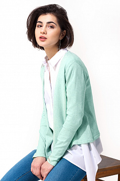 Приталенный жакет с драпированной планкой и асимметричной линией низа. Изделие связано из эластичной хлопковой пряжи. На манжете декоративная металлическая нашивка с логотипом.