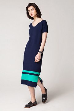 Вязаное платье выполнено из плотной гладкой вискозной пряжи с контрастными полосками по низу. Изделие свободного прямого силуэта с V-образным вырезом горловины и боковыми разрезами по низу.