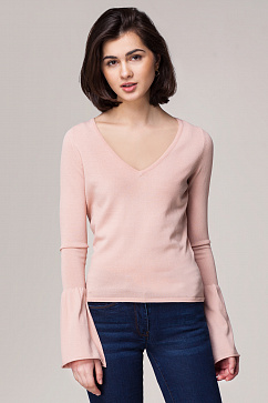 Джемпер выполнен из гладкой вискозной пряжи с добавлением нейлона для меньшей сминаемости полотна. Изделие полуприлегающего силуэта с глубоким вырезом горловины. Втачной рукав с широким воланом по низу.
