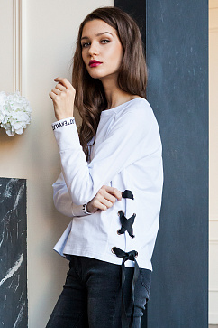 Эффектный хлопковый свитшот свободного покроя выполнен из футера. Рукава реглан с широкими манжетами с принтом. Высокие разрезы в боковых швах дополнены крупными люверсами с завязками на контрастную репсовую ленту.