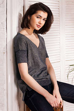 Пуловер с коротким рукавом выполнен из вязаного трикотажа с добавлением нити люрекса. Oversize-крой, глубокий V-образный вырез. Спущенное плечо с широкой двойной манжетой. Изделие с удлиненной спинкой и деталями в рубчик.