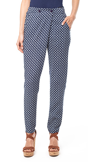 Брюки с запАхом изготовлены из вискозного штапельного полотна с принтом в этническом стиле. Свободный покрой не стесняет движений. Изделие на эластичном поясе, спереди наклонные карманы.