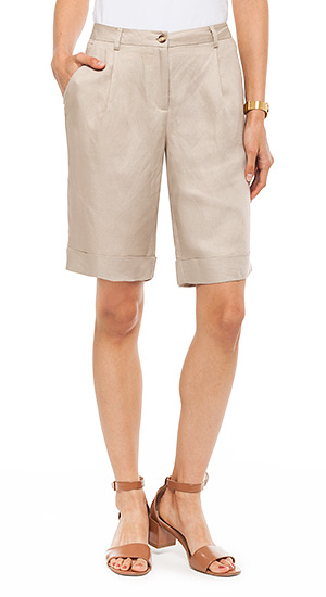Удобные и универсальные шорты на каждый день. Удлиненная модель с широкими прямыми штанинами с отворотом и прорезными карманами выполнена из текстурированного материала вискозы со льном.