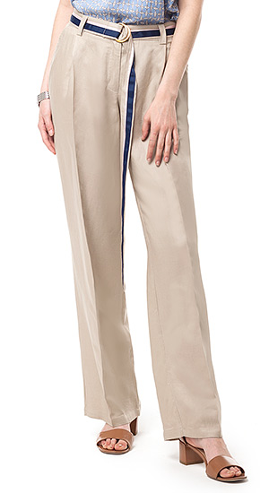 Широкие брюки "палаццо" с прямыми штанинами и скульптурными стрелками по всей длине выполнены из плотной вискозной ткани с добавлением льна. В комплекте эффектный длинный ремешок в контрастную полоску с пряжкой с полукольцами.
