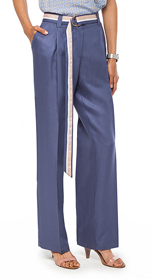 Широкие брюки "палаццо" с прямыми штанинами и скульптурными стрелками по всей длине выполнены из плотной вискозной ткани с добавлением льна. В комплекте эффектный длинный ремешок в контрастную полоску с пряжкой с полукольцами.