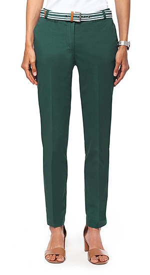 Укороченные брюки-дудочки со стрелкой выполнены из плотного хлопкового полотна с эластаном сатинового плетение с мягким атласным блеском. Спереди наклонные карманы, сзади карманы в рамку. Ремень входит в стоимость изделия.