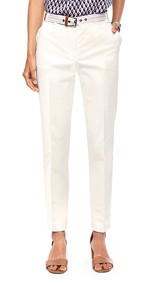 Укороченные брюки-дудочки со стрелкой выполнены из плотного хлопкового полотна с эластаном сатинового плетение с мягким атласным блеском. Спереди наклонные карманы, сзади карманы в рамку. Ремень входит в стоимость изделия.