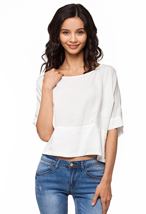 Укороченная блузка из штапельного вискозного полотна с легким эффектом жатости. Изделие приталенного силуэта с отрезным поясом и широким рукавом "летучая мышь". асимметричная спинка с декоративной молнией.