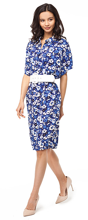 Платье-миди выполнено из фактурного вискозного полотна с трендовым цветочным узором. Свободный силуэт с заужением к низу драпируется по фигуре. Стильный широкий ремень из иск. кожи в комплекте.