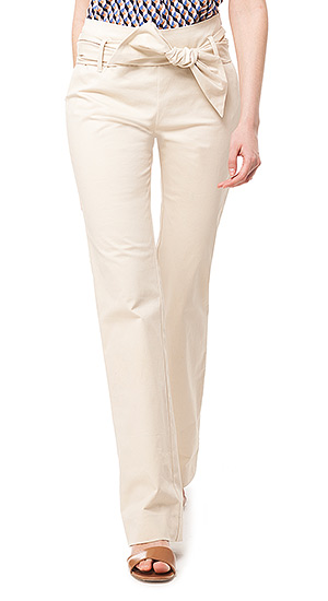 Брюки-клеш с завышенной талией выполнены из плотной хлопковой ткани с эластаном. Съемный пояс завязывается на талии на бант. Застежка на потайную молнию сбоку. Сзади ложные карманы с листочкой.