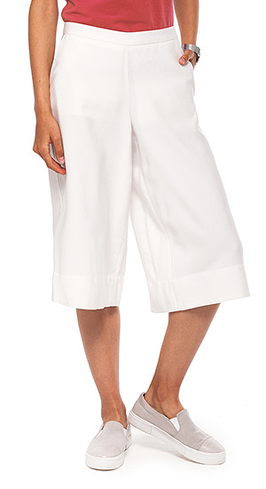Стильные брюки-кюлоты, выполненные из плотного хлопкового полотна. Широкие штанины с легким расклешением от бедра, по бокам наклонные карманы.