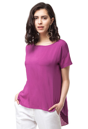 Яркая блузка свободного силуэта выполнена из мягкого вискозного полотна. Особенность изделия - эффектная удлиненная спинка с запАхом и плиссированной вставкой из плотного шифона.