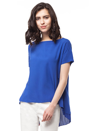 Яркая блузка свободного силуэта выполнена из мягкого вискозного полотна. Особенность изделия - эффектная удлиненная спинка с запАхом и плиссированной вставкой из плотного шифона.
