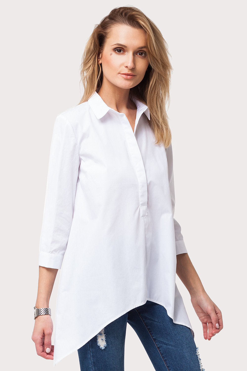 Струящаяся блузка А-силуэта выполнена из хлопкового полотна с добавлением полиэстра для меньшей сминаемости изделия. Асимметричный крой с удлиненными боками. Рубашечный крой с отложным воротником, потайная планка на пуговицах до талии.